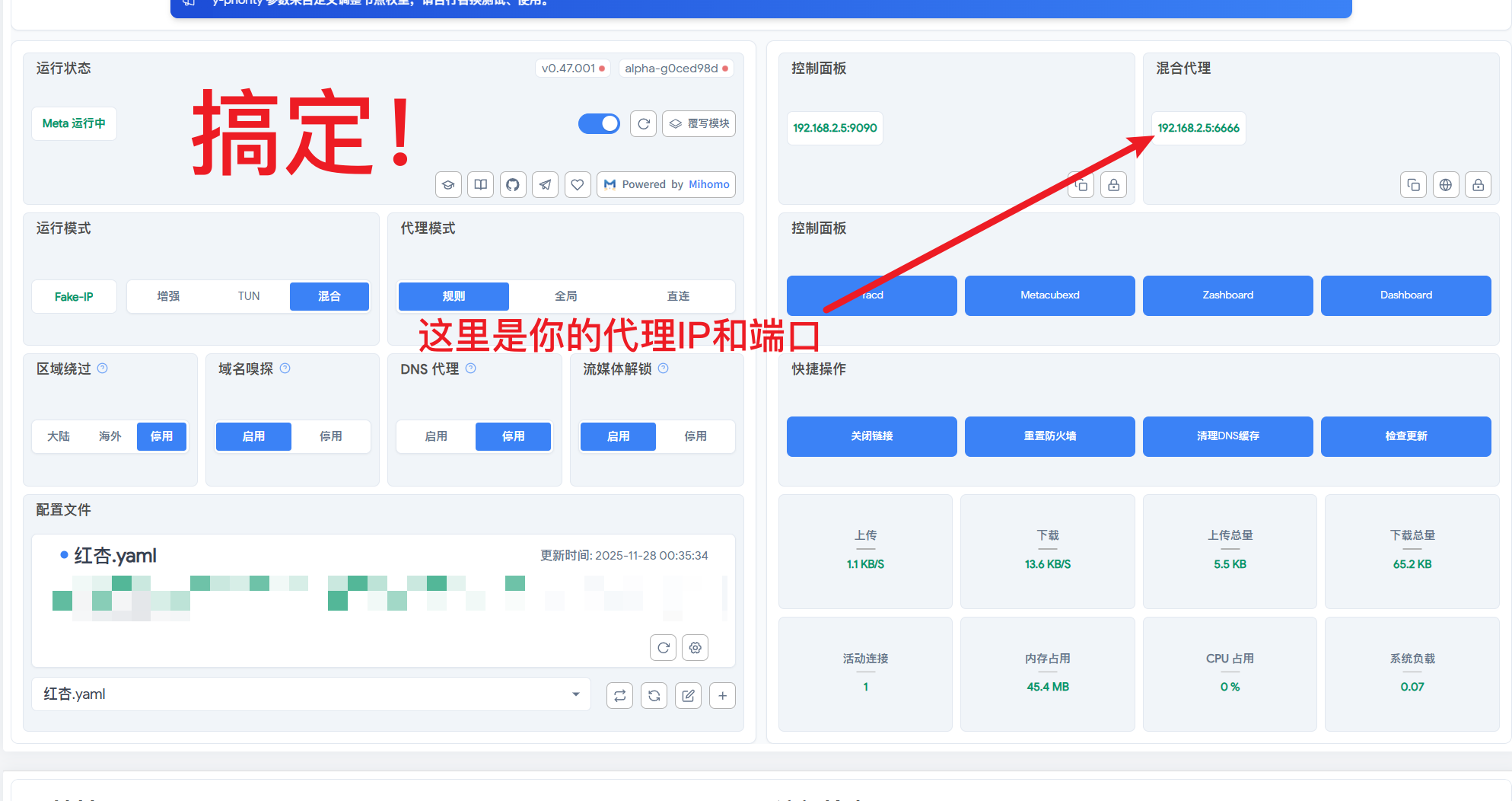 PS:在使用一键部署时填写的IP和端口是这个内容。容器需要代理时用的也是这个。也可以作为家庭的代理网关。